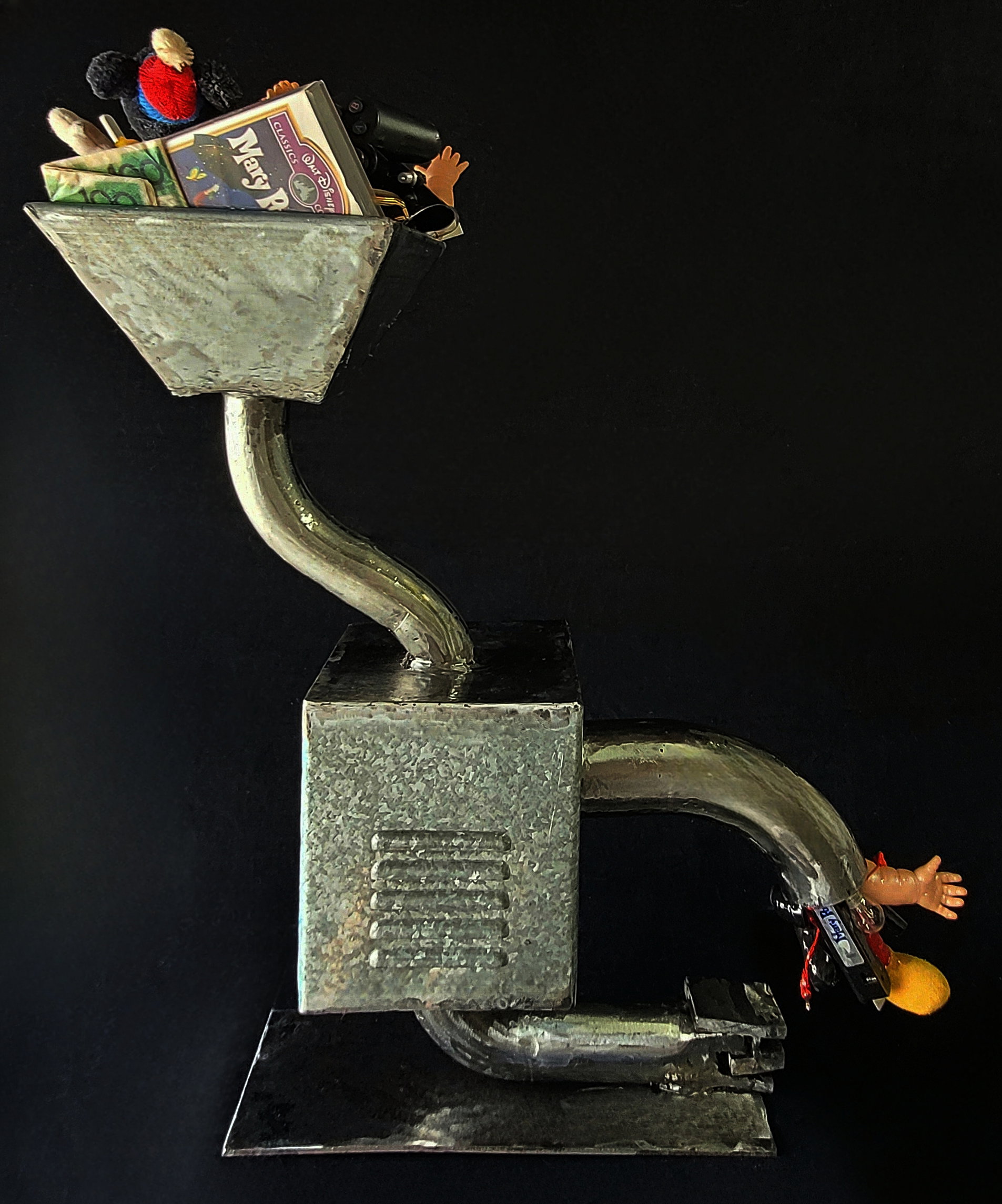 Inspired by Edward Hopper's painting and bearing the same name, Early Sunday Morning is a composition of individually cut out royalty free images. Unlike Hopper's quiet work, this collage is loud and a cacophony of colour, competing signs, billboards, cars and structures. All signs of life are on billboards, everywhere else is just evidence of human activity. There's no soul, just an affirmation of the self through a jostling of space, repetition and lures to consumption.
